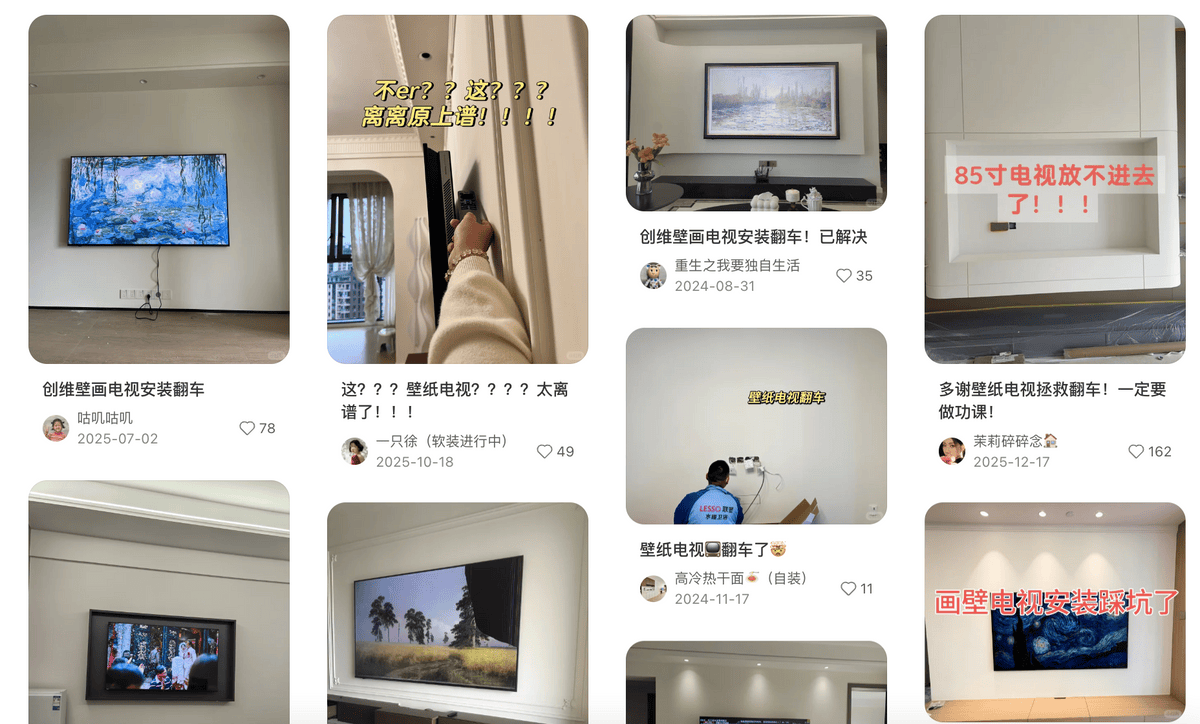 最近在小红书刷到不少朋友吐槽壁纸电视翻车的案例:要么画质太差,画面糊成一团;要么上墙之后发现“想象很美好,现实很骨感”,美观度直接打折;还有的色彩还原不够真实,挂在墙上更像一幅廉价的装饰画。总结下来就